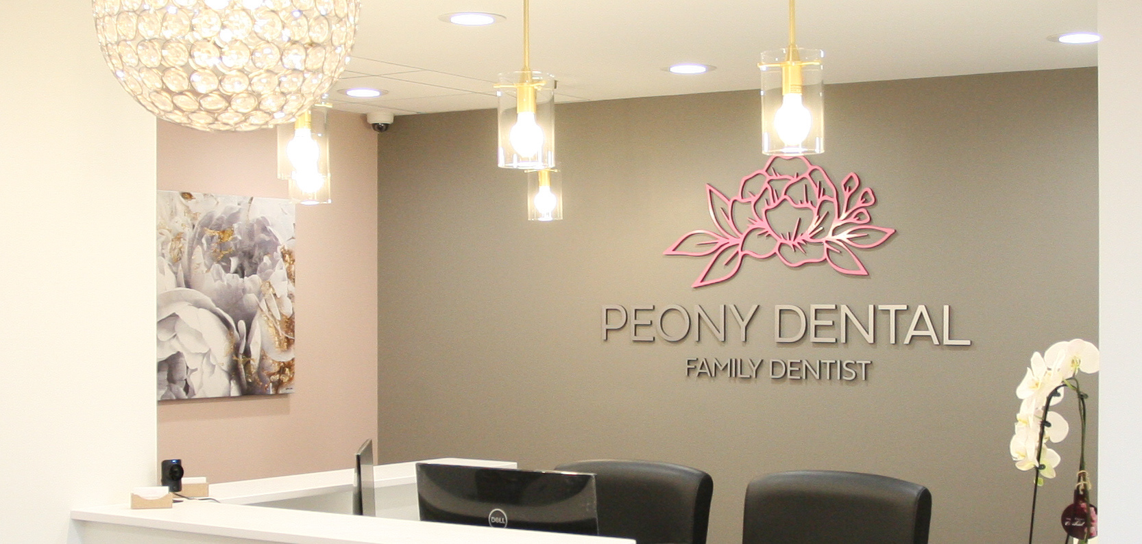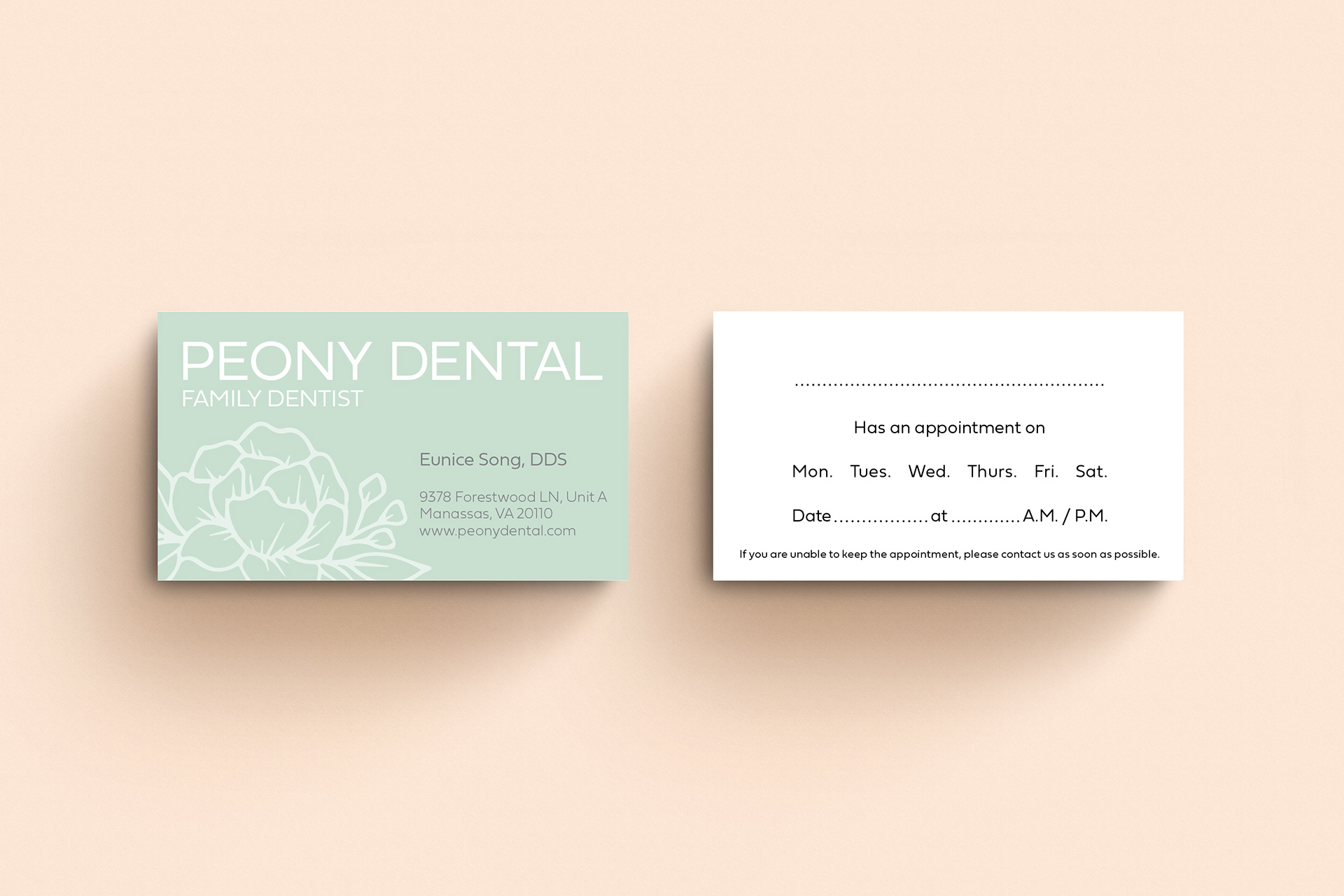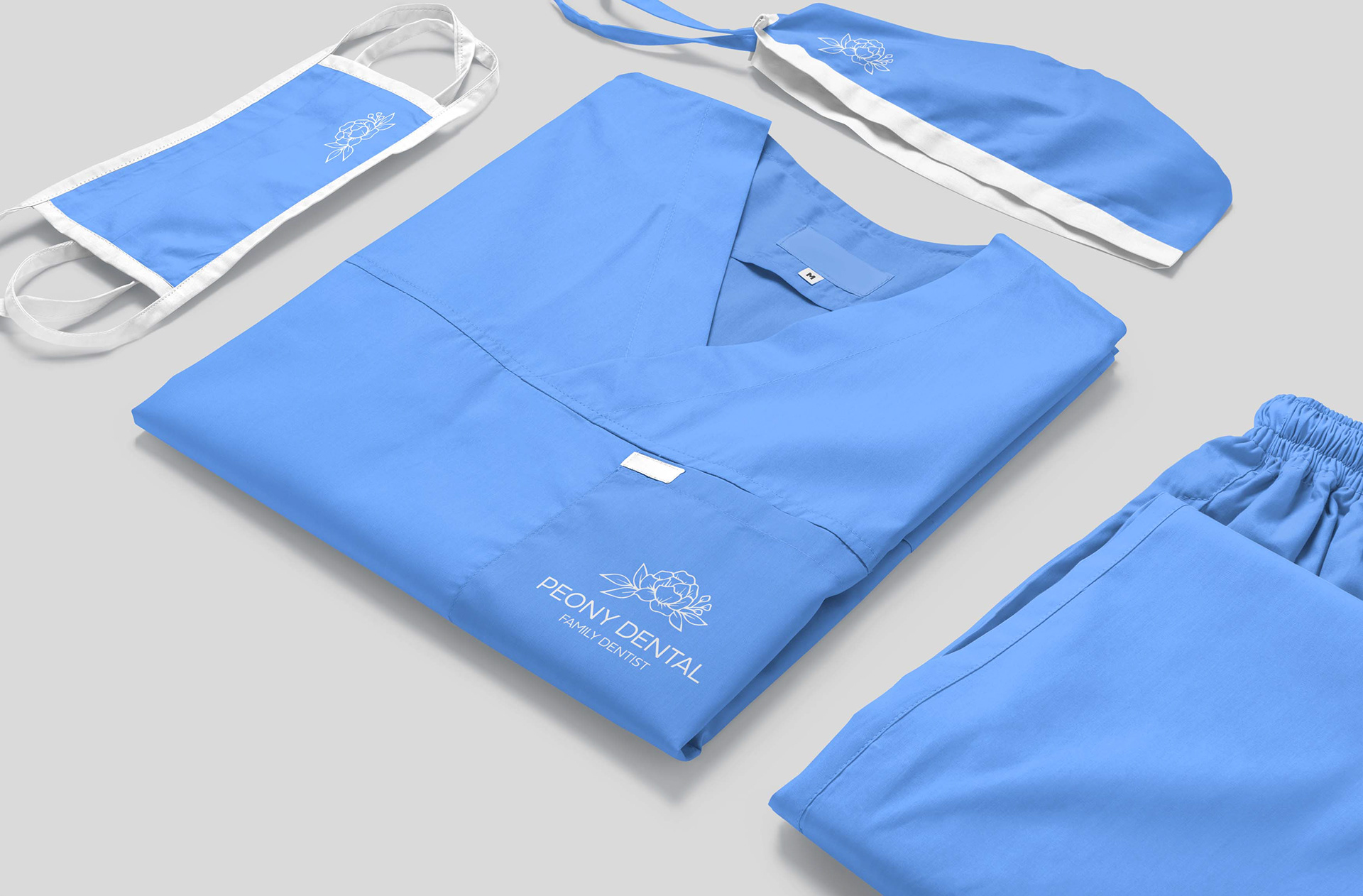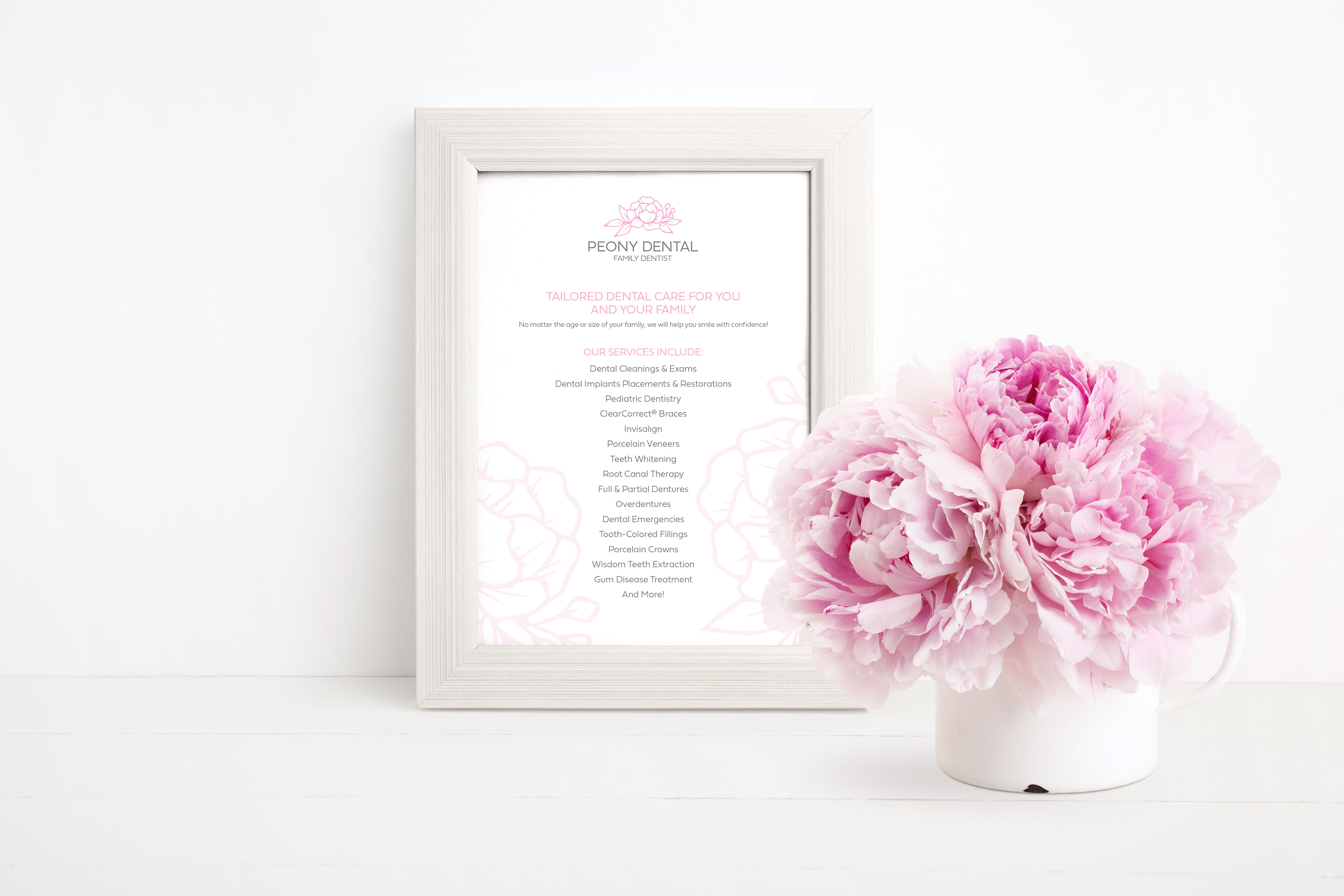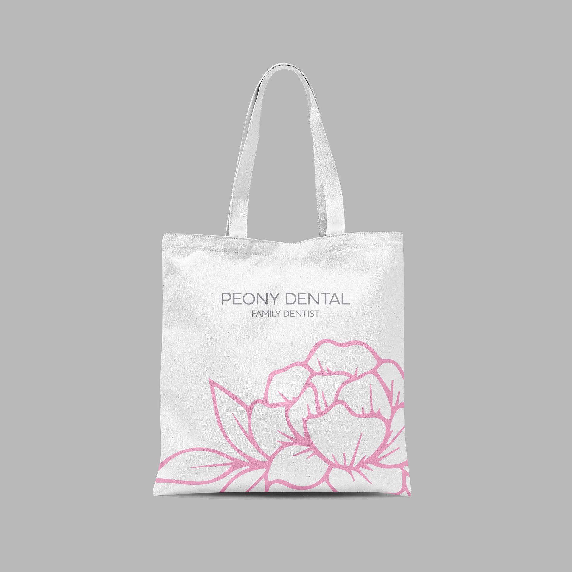 Brand identity for Peony Dental implemented on stationary, marketing collaterals, promotions, and signages.
